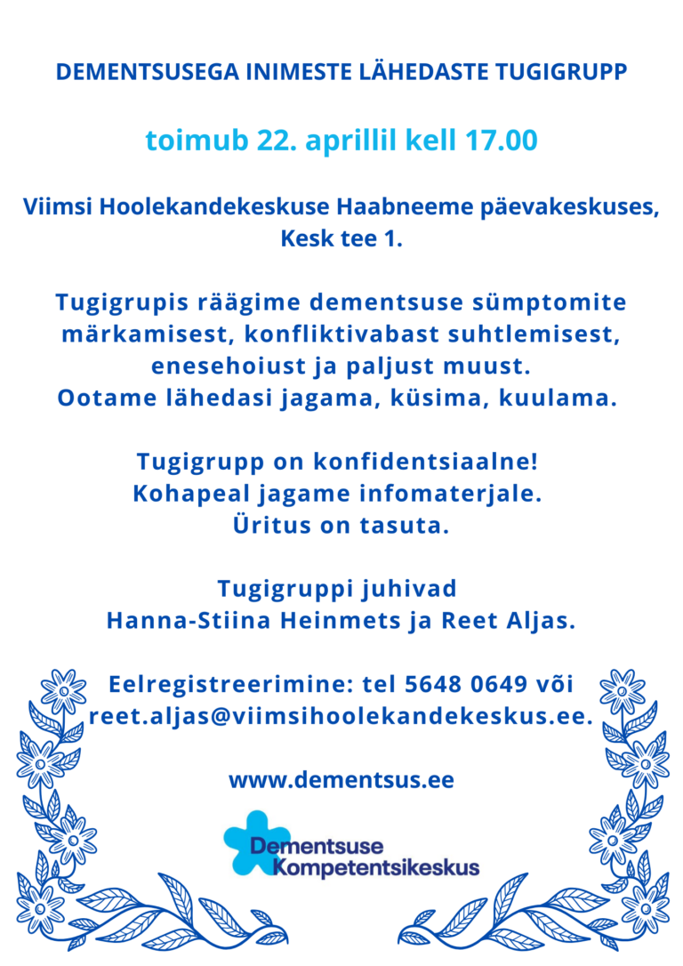 Dementsusega isikute lähedaste tugirühm Haabneeme päevakeskuses Hea teadaKirjutas reet.aljasaprill 2, 2025 Dementsusega isikute lähedaste tugirühm toimub 22.04 kell 17.00 Haabneeme päevakeskuses Loe edasi