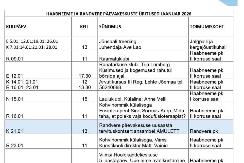 Viimsi Hoolekandekeskuse Haabneeme ja Randvere päevakeskused soovivad Head Uut Aastat 2026 ning ootavad JAANUARIS järgmistele üritustele: Hea teadajaanuar 3, 2026 Loe edasi
