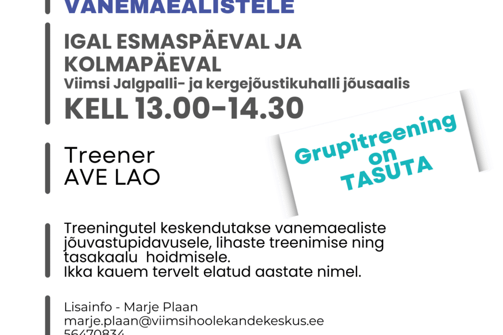 Jõusaali treeningud (55+) toimuvad esmaspäeval ja kolmapäeval Viimsi jalgpalli- ja kergejõustikuhallis. Hea teadajaanuar 7, 2026 Loe edasi