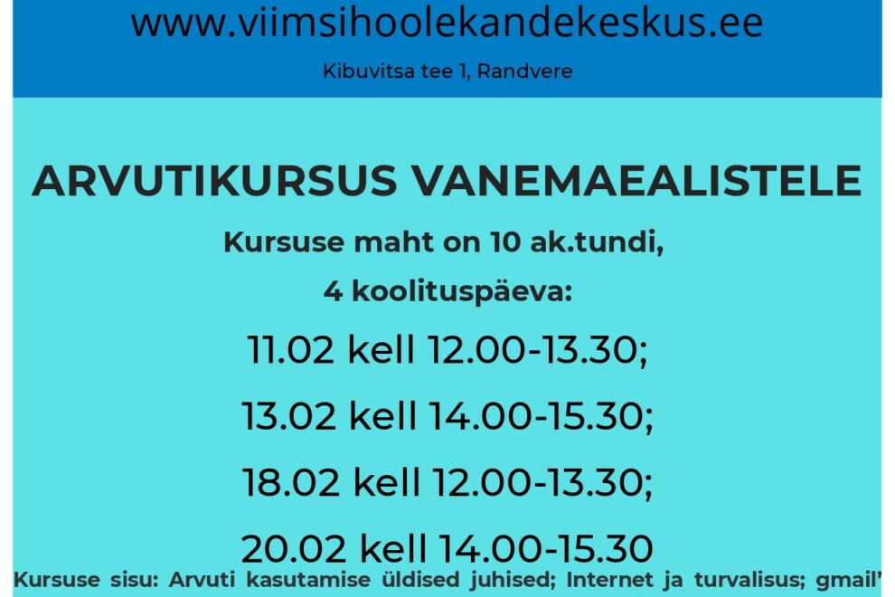 Arvutikursus IV toimub Randvere päevakeskuses VEEBRUARIS. Eelreg Aime Salmistu, tel 56907520. Jälgi reklaami! Kursus on TASUTA! Hea teadajaanuar 30, 2026 Loe edasi