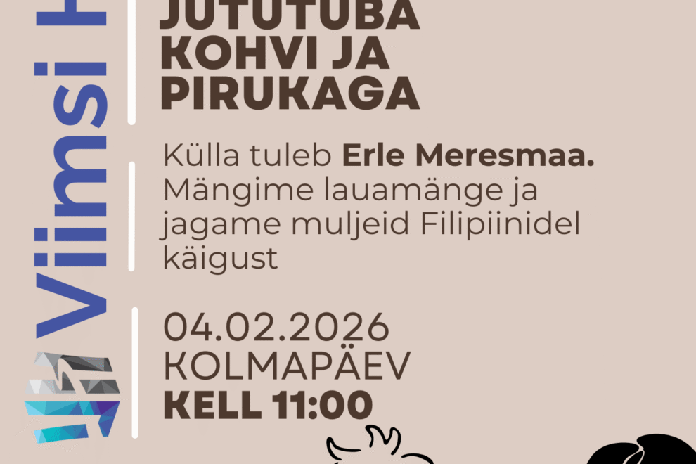 Randvere päevakeskuse jututoas on külas Erle Meresmaa. Mängitakse lauamänge ja kuultakse Erle muljeid Filipiinidelt. Kuum kohv ja soe pirukas on garanteeritud. Hea teadajaanuar 30, 2026 Loe edasi