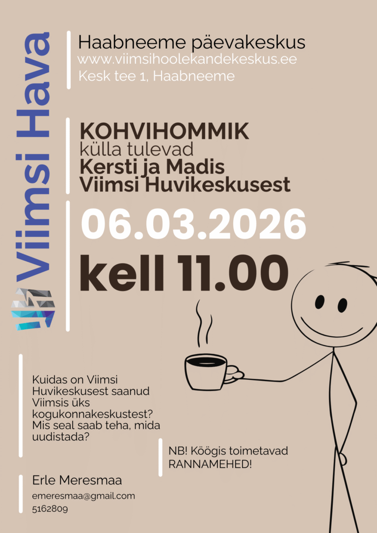 Haabneeme päevakeskuse kohvihommikul on külas Viimsi Huvikeskus. Köögis toimetavad RANNAMEHED! Tule osa saama! Hea teadaKirjutas marje.plaan@viimsihoolekandekeskus.eeveebruar 26, 2026 Loe edasi