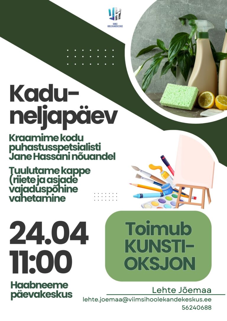 Kaduneljapäeval ootame Haabneeme päevakeskusesse külla Jane Hassanit, et rääkida sellest, kuidas peaks koristama. Tuulutame kappe (riiete ja asjade vajaduspõhine vahetamine). Toimub kunstioksjon Hea teadaKirjutas marje.plaan@viimsihoolekandekeskus.eeaprill 2, 2025 Loe edasi