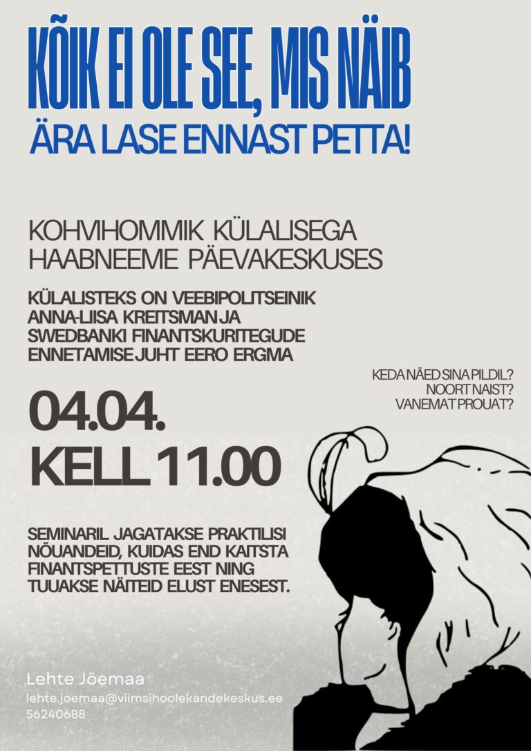 Aprillikuu esimesel kohvihommikul teeme Haabneeme päevakeskuses juttu sellest, kuidas kaitsta end finantskuridegude eest. Külas on veebipolitseinik Anna-Liisa Kreitsman ja Swedbanki finantskuritegude ennetamise juht Eero Ergma