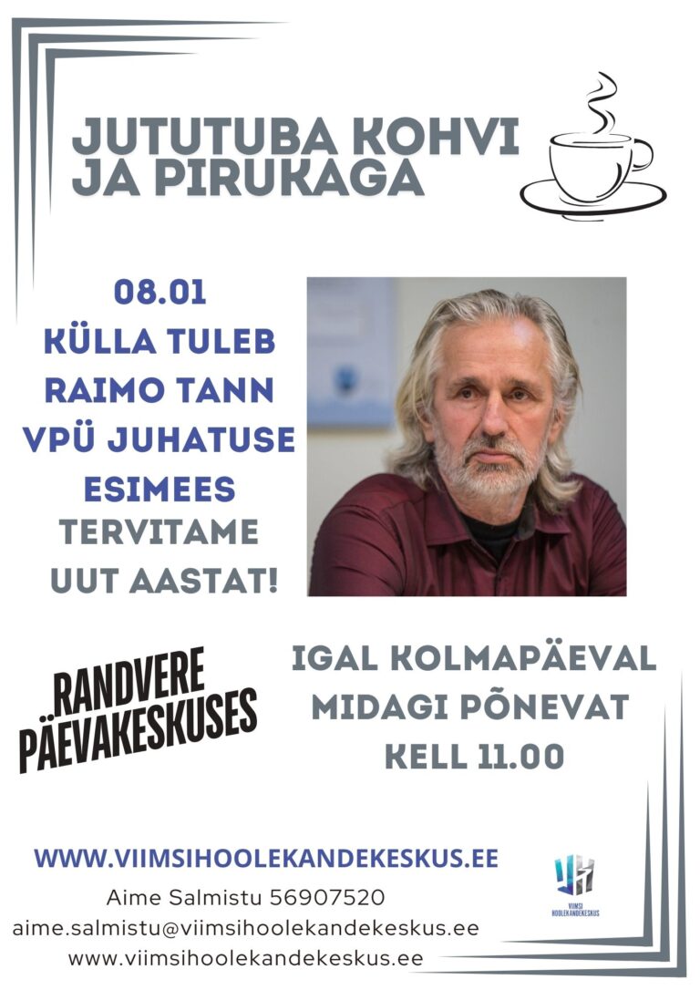 Uuel Aastal uue hooga! Randvere päevakeskuse kolmapäevase jututoa esimeseks külaliseks on VPÜ juhatuse esimees Raimo Tann. Hea teadaKirjutas marje.plaan@viimsihoolekandekeskus.eejaanuar 3, 2025 Loe edasi
