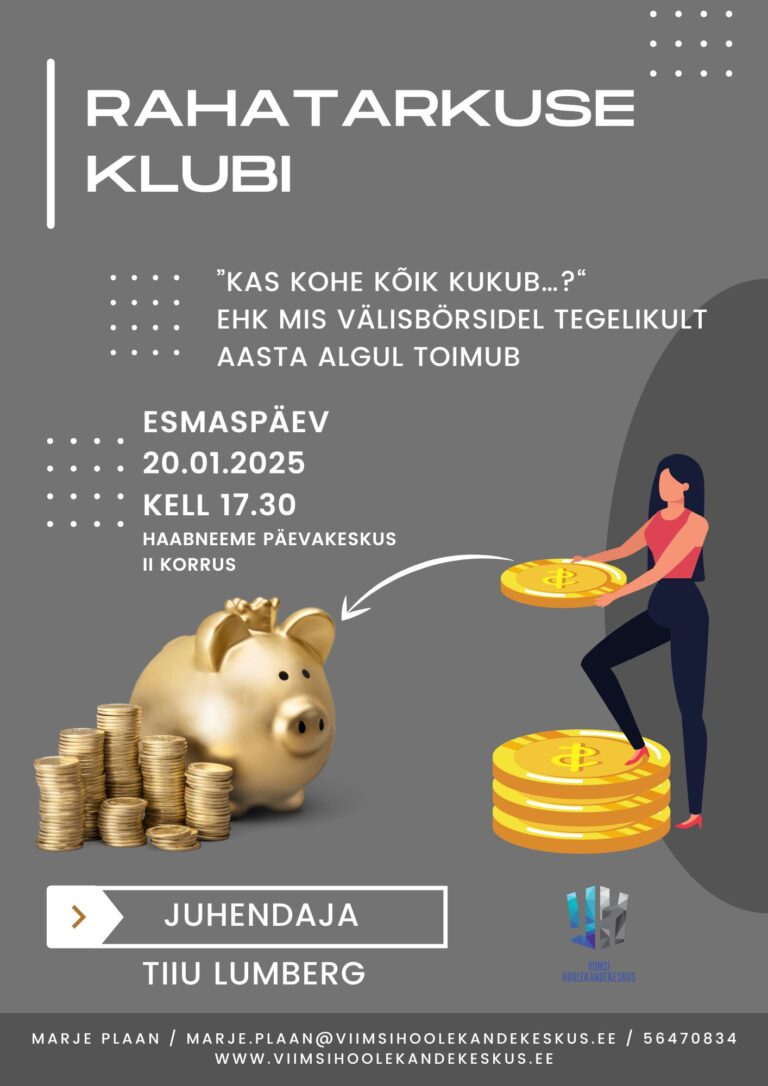 Haabneeme päevakeskuses koguneb korra kuus, esmaspäeviti, rahatarkuse klubi. Seekord arutatakse, mis välisbörsidel aasta alguses toimub. Juhendaja on viimsilane Tiiu Lumberg Hea teadaKirjutas marje.plaan@viimsihoolekandekeskus.eejaanuar 7, 2025 Loe edasi