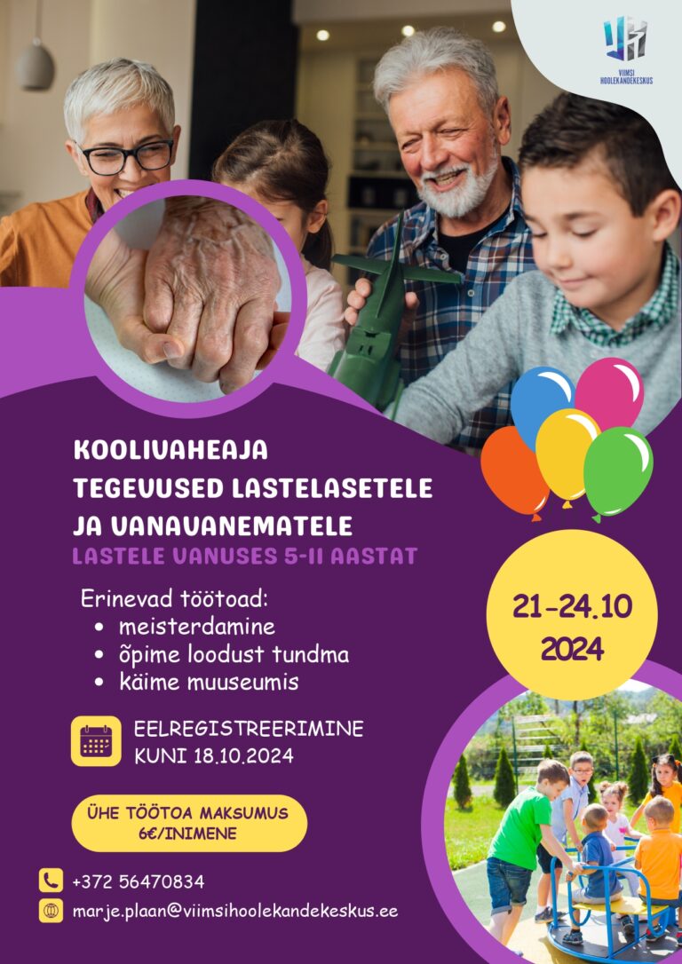 Koolivaheajal, 21.-24.10., ootame lapselapsi ja vanavanemaid ühistegevustele. Tule pane ennast kirja! Hea teadaKirjutas marje.plaan@viimsihoolekandekeskus.eeseptember 30, 2024 Loe edasi