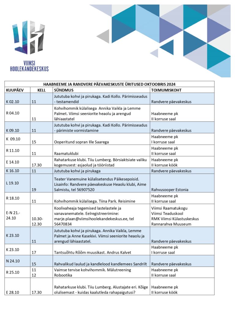 Viimsi Hoolekandekeskuse päevakeskused ootavad teid oktoobris järgmistele üritustele. Hea teadaKirjutas marje.plaan@viimsihoolekandekeskus.eeoktoober 1, 2024 Loe edasi