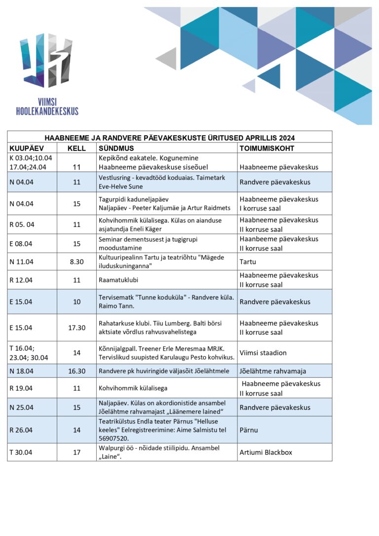 Haabneeme ja Randvere päevakeskused ootavad kõiki üritustest osa saama Hea teadaKirjutas marje.plaan@viimsihoolekandekeskus.eemärts 1, 2024 Loe edasi