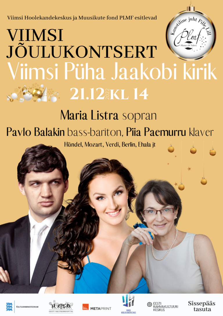 Kolmapäeval, 21. detsembril kell 14, toimub Viimsi Püha Jaakobi kirikus Muusikute fondi PLMF kontsert. Esinevad sopran Maria Listra, bass Pavlo Balakin ja pianist Piia Paemurru. Kavas: Händel, Mozart, Verdi, Berlin, Ehala jt. Kontserdile on vaba sissepääs! Kõik on oodatud! MARIA LISTRA on Eesti üks väljapaistvamaid artiste, tegutsedes vokaalsolisti ja õpetajana. Oma loomingulises karjääris kombineerib ta muusikateatri ja -kultuuri erinevaid väljendusvorme –…