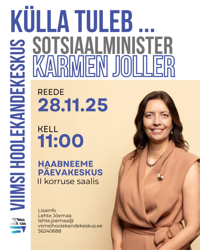 Viimsi Hoolekandekeskusele tuleb külla sotsiaalminister KARMEN JOLLER. Oled oodatud vestlusringi. Hea teadaKirjutas marje.plaan@viimsihoolekandekeskus.eenovember 27, 2025 Loe edasi