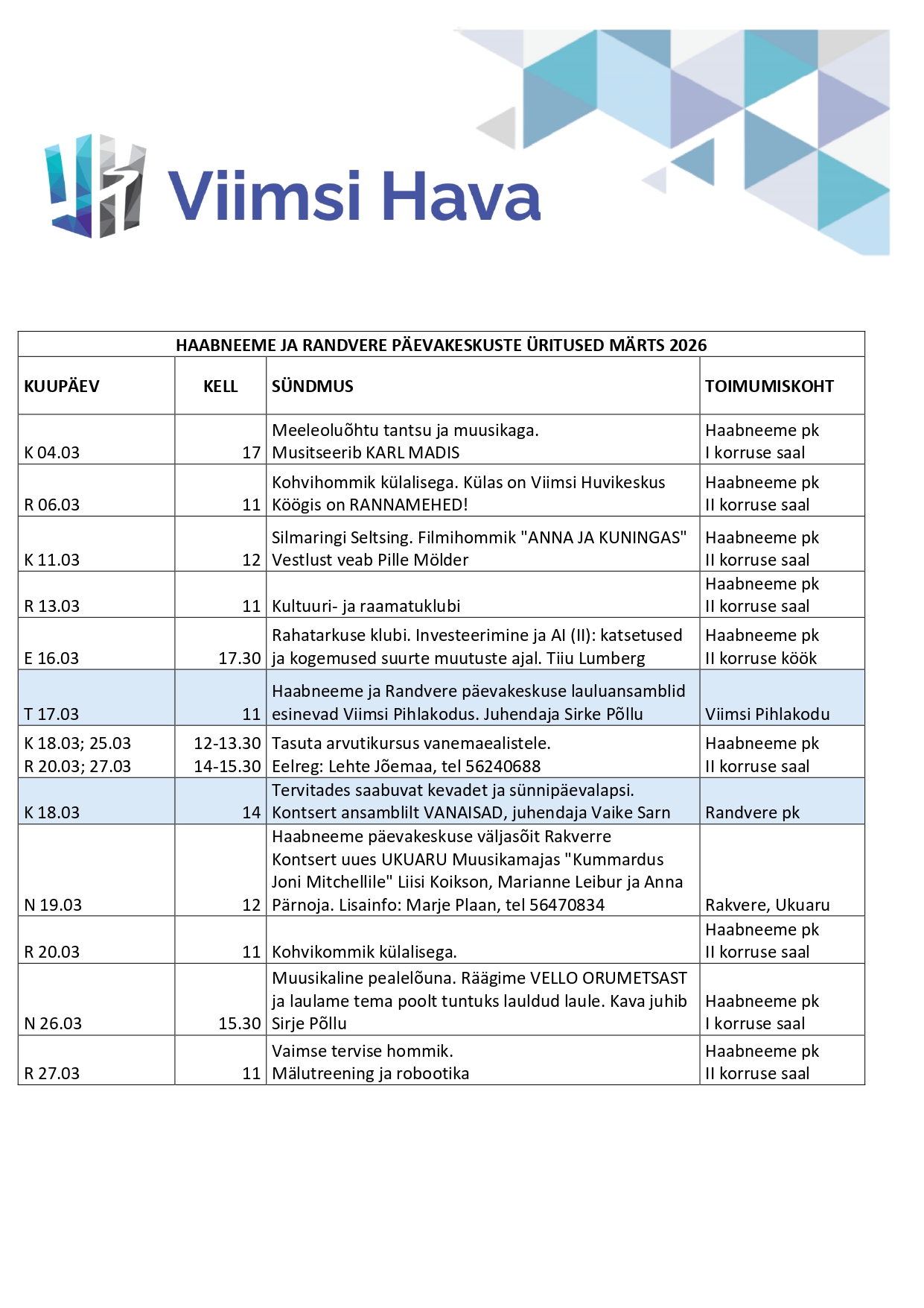 Kategooria: Hea teadamärts 2, 2026 Jaga postitust Share on FacebookShare on Facebook Share on XShare on X Post navigationEelminePrevious post:Vaimse tervise hommikul Haabneeme päevakeskuses teeme mälutrenni ja tegeleme robootikaga. Astu läbi!Sarnased postitusedVaimse tervise hommikul Haabneeme päevakeskuses teeme mälutrenni ja tegeleme robootikaga. Astu läbi!veebruar 26, 2026Haabneeme päevakeskuses toimuval muusikalisel pärastlõunal on seekord teemaks VELLO ORUMETS. Kava juhib Sirje Põlluveebruar 26, 2026Randvere päevakeskuses tervitatakse saabuvat kevadet ja sünnipäevalapsi. Kontsert ansamblilt VANAISAD, juhendaja VAIKE SARNveebruar 26, 2026Kultuuri- ja raamatuklubi koguneb Haabneeme päevakeskuses kuu teisel reedel. Jälgi reklaami ja tule toredasse vestlusringiveebruar 26, 2026Silmaringi Seltsing vaatab seekord filmi “Anna ja kuningas”. Vestlust veab Pille Mölderveebruar 26, 2026Haabneeme päevakeskuse kohvihommikul on külas Viimsi Huvikeskus. Köögis toimetavad RANNAMEHED! Tule osa saama!veebruar 26, 2026
