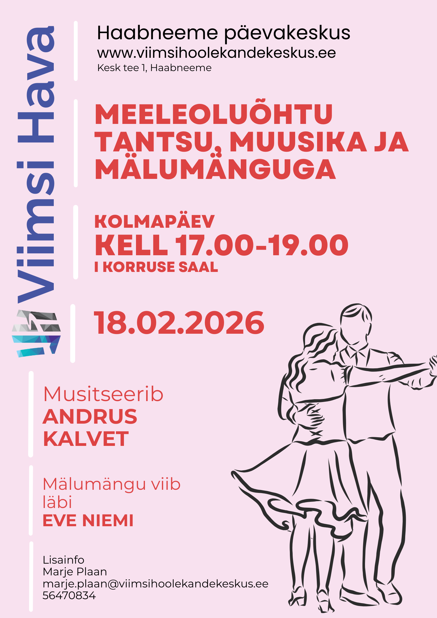 Kategooria: Hea teadaveebruar 6, 2026 Jaga postitust Share on FacebookShare on Facebook Share on XShare on X Post navigationEelminePrevious post:Dementsusega isikute lähedaste tugigrupp kohtub juba 10.02.kell 17.00 Haabneeme keskuse II korruselJärgmineNext post:Eesti Vabariigi 108. aastapäeva puhul toimub Haabneeme päevakeskuses kontsert, kus esinevad Viimsi Kooli lastekoor ja rahvatantsurühm SiiraViira. Eesti Sõjamuuseumi teadur Ranno Sõnum räägib Eesti Vabadussõjast. Kaetud on kohvilaud.Sarnased postitusedVastlapäeva tähistatakse Randvere päevakeskuses vanade kommete kohaselt. Kindlasti on olemas ka vastlakuklid. Astu läbi!veebruar 10, 2026Rahatarkuse klubis arutatakse teemal, kuidas AI võiks investeerimisel kasutada. Oma kogemusi jagab TIIU LUMBERGveebruar 10, 2026Haabneeme raamatuklubis on külas KULLE RAIG. Tule mõnusasse vestlusringi. Teema on väga huvitav – Lennart Meri elu sõprade pilgu läbi.veebruar 10, 2026Veebruari viimasel reedel tulevad Haabneeme päevakeskusesse mälutreenerid. Tule vaatama, kuidas on võimalik mälu parandada. Omad nipid selleks on ka robootikal. Oled oodatud!veebruar 6, 2026Eesti Vabariigi 108. aastapäeva puhul toimub Haabneeme päevakeskuses kontsert, kus esinevad Viimsi Kooli lastekoor ja rahvatantsurühm SiiraViira. Eesti Sõjamuuseumi teadur Ranno Sõnum räägib Eesti Vabadussõjast. Kaetud on kohvilaud.veebruar 6, 2026Dementsusega isikute lähedaste tugigrupp kohtub juba 10.02.kell 17.00 Haabneeme keskuse II korruselveebruar 2, 2026