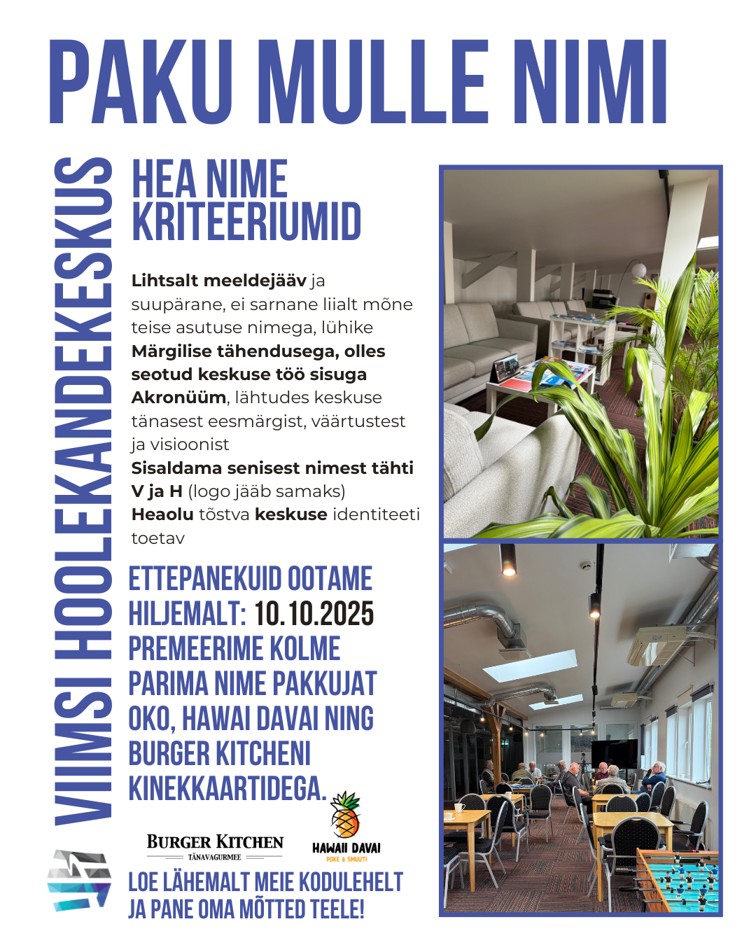 Viimsi Vallavalitsus koos Viimsi Hoolekandekeskusega otsib konkursiga nime Viimsis vanemaealistele huvitegevust ja erivajadustega inimestele hoolekandeteenuseid osutavale 2021. aastal loodud Viimsi Hoolekandekeskusele. Keskus tegutseb kahel aadressil ja valmimisel on kolmas asukoht. Uus nimi seob ühtseks tervikuks nii pakutavad teenused kui erinevad üksused.