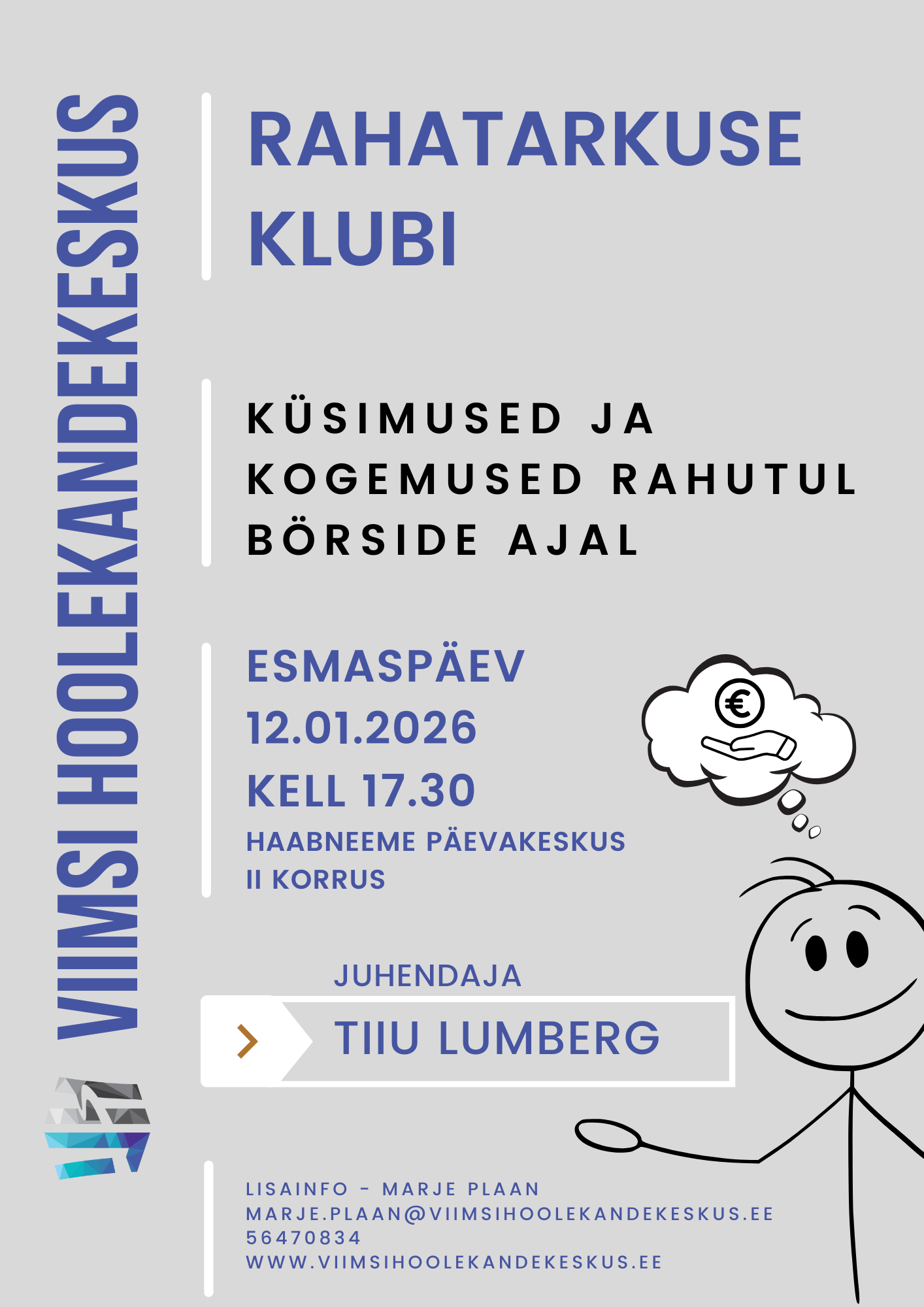 Kategooria: Hea teadajaanuar 7, 2026 Jaga postitust Share on FacebookShare on Facebook Share on XShare on X Post navigationEelminePrevious post:Raamatuklubi koguneb Haabneeme päevakeskuses vaid korra kuus. Jälgi reklaami!JärgmineNext post:Lauluklubi koguneb Haabneeme päevakeskuses korra kuus neljapäeval. Seekord on külaliseks ANNE VELLI.Sarnased postitusedIga kuu viimasel reedel kogunevad Haabneeme päevakeskuses mälutreeningu ja robootika huvilised. Toimub vaimse tervise hommikjaanuar 7, 2026Haabneeme päevakeskuses on kohvihommiku külaliseks Viimsi Kunstikooli direktor Matti Vainio. Saame tutvuda ka tema töödega.jaanuar 7, 2026Randvere päevakeskuses esineb Uusaasta kontserdil ansambel AMULETTjaanuar 7, 2026Selle aasta esimesel kohvihommikul Haabneeme päevakeskuses on külaliseks füsioterapeut Siret Sõrmus-Karpjaanuar 7, 2026Lauluklubi koguneb Haabneeme päevakeskuses korra kuus neljapäeval. Seekord on külaliseks ANNE VELLI.jaanuar 7, 2026Raamatuklubi koguneb Haabneeme päevakeskuses vaid korra kuus. Jälgi reklaami!jaanuar 7, 2026