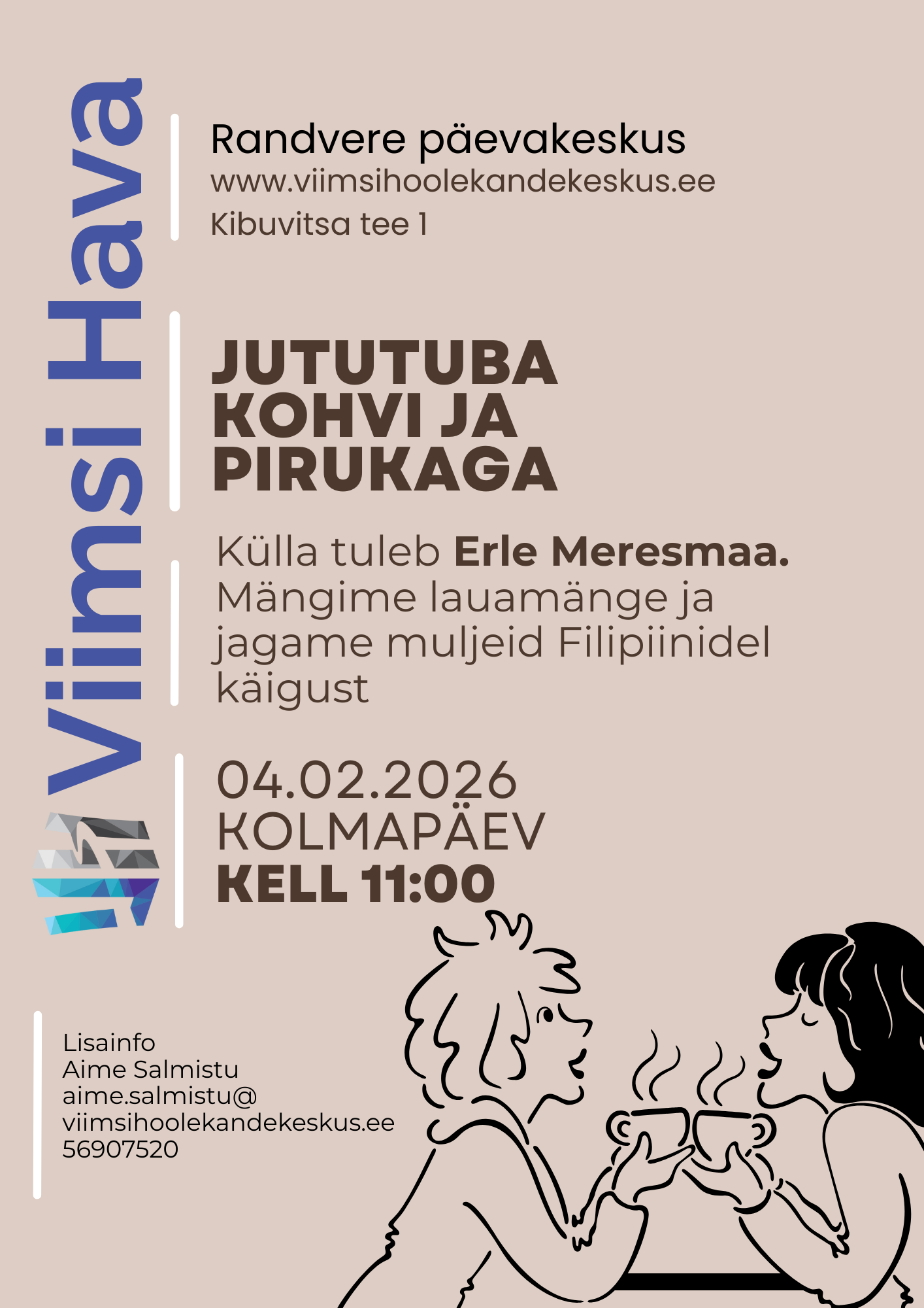 Haabneeme päevakeskuse kohvihommiku külaliseks on Erle Meresmaa. Mängime lauamänge ja kuulame Erle muljeid Filipiinidelt.jaanuar 30, 2026