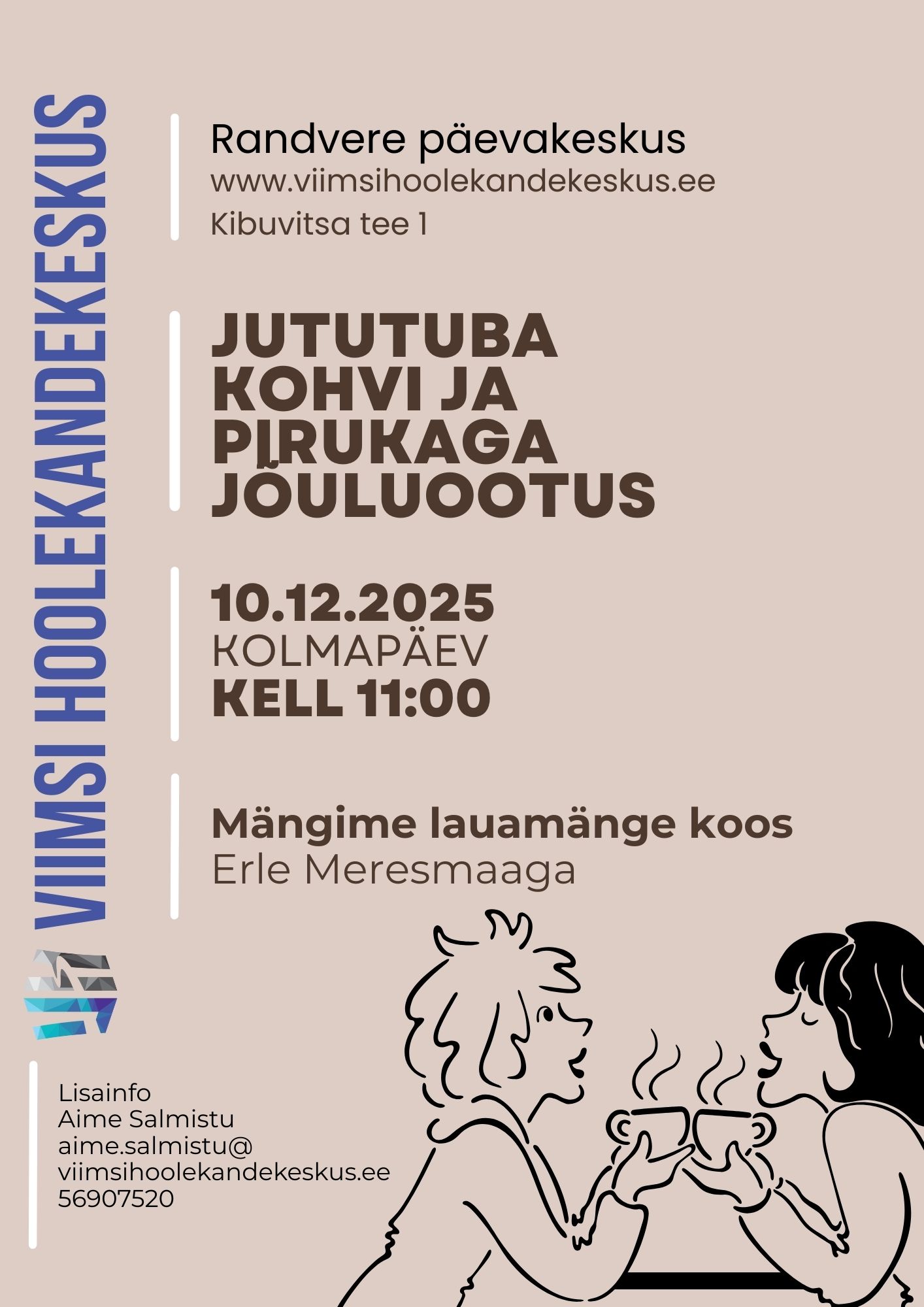 Kategooria: Hea teadadetsember 2, 2025 Jaga postitust Share on FacebookShare on Facebook Share on XShare on X Post navigationEelminePrevious post:Haabneeme päevakeskuses toimub jõulupärja valmistamise töötuba. (E 8.12 ja R 12.12) Viib läbi Anneli JüriojaJärgmineNext post:Silmaringi seltsing on jututuba uudishimulikele. Jõuludega ümber ilma, vaatame, mia puutub silma. Vestlusringi veab Pille Mölder.Sarnased postitusedKirikukontserdil Püha Jaakobi kirikus esineb ansambel BEATI MANDOLINI. Kontsert on TASUTA. Oled oodatud osalema!detsember 2, 2025Randvere päevakeskus võtab aasta kokku toreda jõuluväljasõiduga Neeme külla. Musitseerib Henn Rebanedetsember 2, 2025Haabneeme päevakeskus korraldab Selveris käsitöölaata. Müügil on kootud sokid, kindad, maalitud portselan, keraamika ja palju muud huvitavat. Esinevad isetegevusringid. Tule vaatama!detsember 2, 2025Lauluklubi koguneb Haabneeme päevakeskuses vaid korra kuus. Seekord lauldakse jõululaule. Eestvedaja SIRJE PÕLLUdetsember 2, 2025Silmaringi seltsing on jututuba uudishimulikele. Jõuludega ümber ilma, vaatame, mia puutub silma. Vestlusringi veab Pille Mölder.detsember 2, 2025Haabneeme päevakeskuses toimub jõulupärja valmistamise töötuba. (E 8.12 ja R 12.12) Viib läbi Anneli Jüriojadetsember 2, 2025