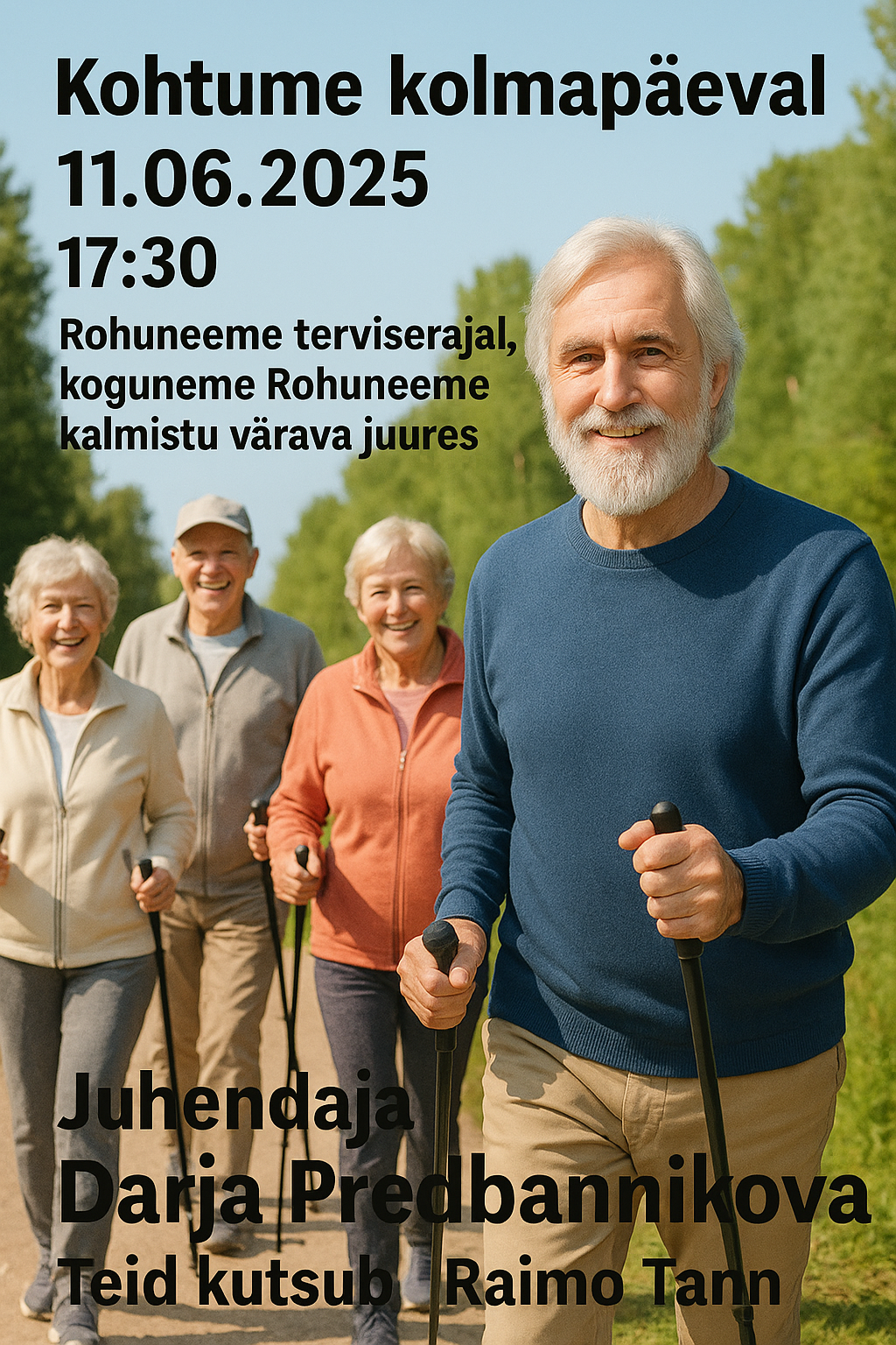 Viimsi liikumisrühm ootab teid igal KOLMAPÄEVAL erinevas kohas. Jälgi reklaami! Tempo on mõõdukas. Koos avastatakse uusi paiku Viimsi kaunis looduses. Aeg on mõelda oma tervisele ja minna liikuma! Lisainfo: Raimo Tann, raimo@paenurme.ee, tel 5172941.