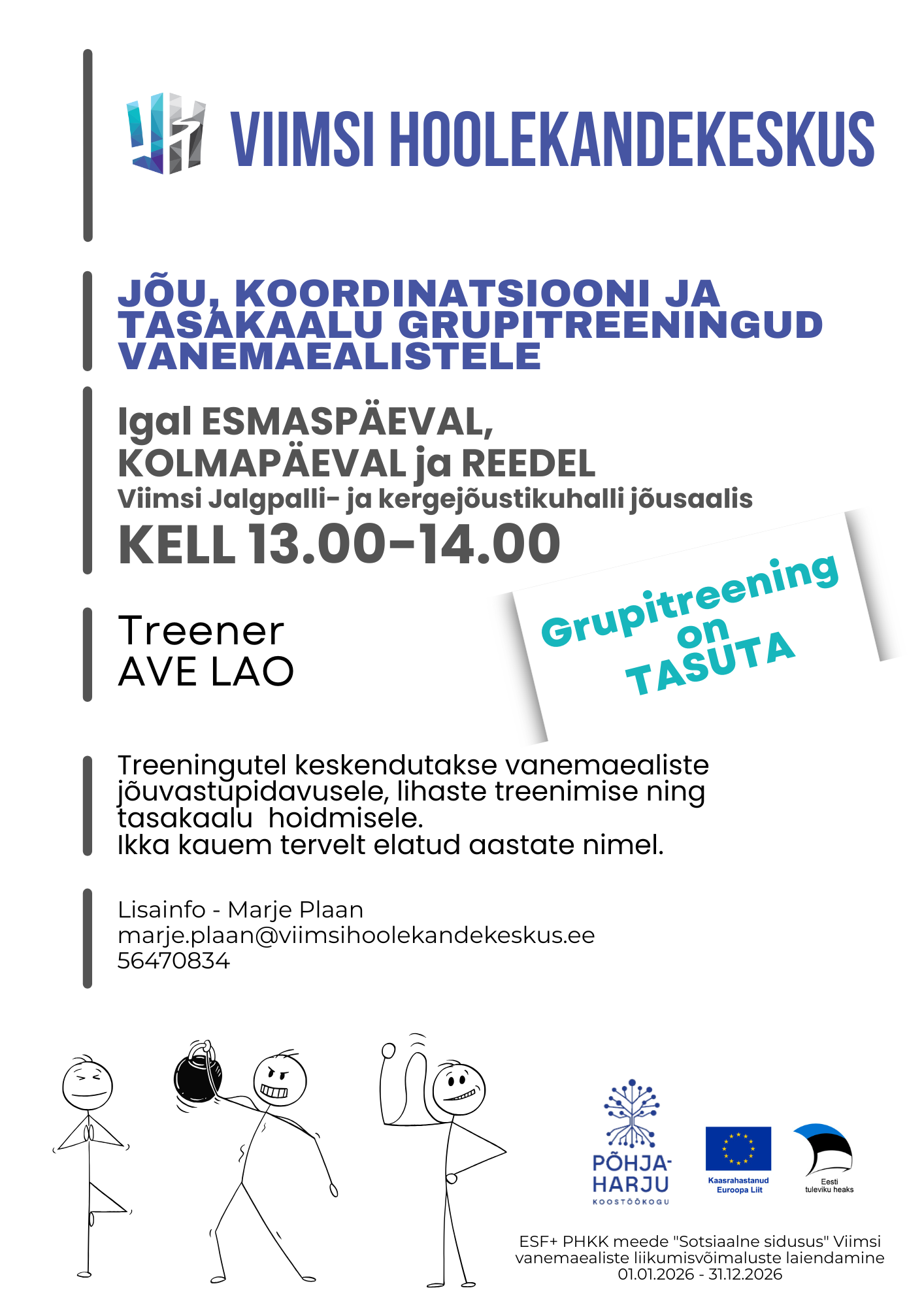2026 jaanuar ETKNRLP 2930311234Events for jaanuar 1Sündmused puuduvadEvents for jaanuar 2Sündmused puuduvadEvents for jaanuar 3Sündmused puuduvadEvents for jaanuar 4Sündmused puuduvad567891011Events for jaanuar 5 13:00 - 14:00Jõusaali treeningEvents for jaanuar 6Sündmused puuduvadEvents for jaanuar 7 13:00 - 14:00Jõusaali treeningEvents for jaanuar 8Sündmused puuduvadEvents for jaanuar 9 11:00 - 13:00Raamatuklubi Haabneeme päevakeskuses 13:00 - 14:00Jõusaali treeningEvents for jaanuar 10Sündmused puuduvadEvents for jaanuar 11Sündmused puuduvad12131415161718Events for jaanuar 12 13:00 - 14:00Jõusaali treening 17:30 - 19:00Rahatarkuse klubi. NB! Õpetaja haigestumise tõttu toimub 26.01. kell 17.30Events for jaanuar 13Sündmused puuduvadEvents for jaanuar 14 12:00 - 13:30Arvutikursus I päev 13:00 - 14:00Jõusaali treeningEvents for jaanuar 15 15:00 - 16:30LauluklubiEvents for jaanuar 16 11:00 - 13:00Kohvihommik külalisega. Füsioterapeut Siret Sõrmus-Karp 13:00 - 14:00Jõusaali treening 13:30 - 15:00Arvutikursus II päevEvents for jaanuar 17Sündmused puuduvadEvents for jaanuar 18Sündmused puuduvad19202122232425Events for jaanuar 19 13:00 - 14:00Jõusaali treeningEvents for jaanuar 20Sündmused puuduvadEvents for jaanuar 21 12:00 - 13:30Arvutikursus III päev 13:00 - 15:00Randvere päevakeskuse Uusasta tervituskontsert. Esineb ansambel AMULETT 13:00 - 14:00Jõusaali treeningEvents for jaanuar 22Sündmused puuduvadEvents for jaanuar 23 11:00 - 13:00Kohvihommik külalisega Haabneeme päevakeskuses. Matti Vainio 13:00 - 14:00Jõusaali treening 13:30 - 15:00Arvutikursus VI päevEvents for jaanuar 24Sündmused puuduvadEvents for jaanuar 25Sündmused puuduvad2627282930311 Events for jaanuar 26 13:00 - 14:00Jõusaali treening 16:00 - 18:00Viimsi Hoolekandekeskuse 5. aastapäev ja UUE NIME avalikustamine 17:30 - 19:00Rahatarkuse klubi. Asendustund 12.01 tunnileEvents for jaanuar 27Sündmused puuduvadEvents for jaanuar 28 12:00 - 13:30Silmaringi Seltsing Haabneeme päevakeskuses 13:00 - 14:00Jõusaali treeningEvents for jaanuar 29 10:30 - 12:00Jututuba kohvi ja pirukaga Randvere päevakeskuses. Külas on raamatu Kohanemise meistriklass autor JÜRI LEHTMETSEvents for jaanuar 30 11:00 - 13:00Vaimse tervise hommik. Mälutreening ja robootika 13:00 - 14:00Jõusaali treeningEvents for jaanuar 31Sündmused puuduvad Kuupäev 16. jaanuar 2026 Kellaaeg 13:00 - 14:00 Jõusaali treening Jaga üritust + Lisa Google kalendrisse + iCal / Outlook eksport
