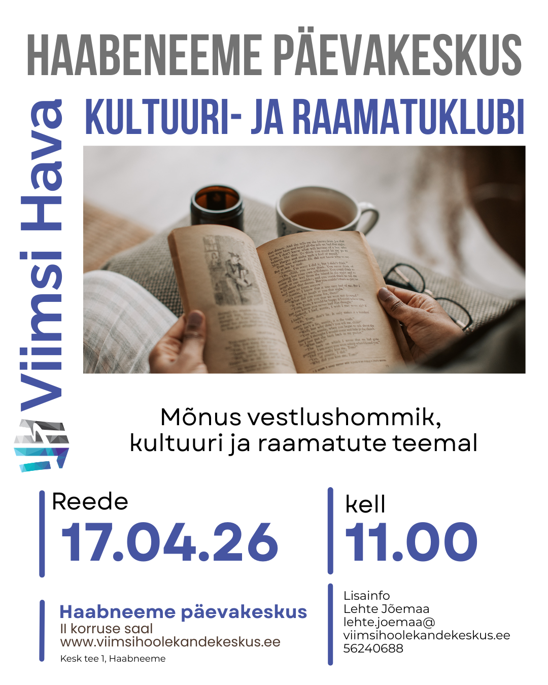 2026 aprill ETKNRLP 303112345Events for märts 30 16:45 - 17:45Elujõu saalitreeningEvents for märts 31 11:00 - 12:00Esinevad Haabneeme päevakeskuse seeniortantsurühm Triinud ja päevakeskuste lauluansamblidEvents for aprill 1Sündmused puuduvadEvents for aprill 2Sündmused puuduvadEvents for aprill 3Sündmused puuduvadEvents for aprill 4Sündmused puuduvadEvents for aprill 5Sündmused puuduvad6789101112Events for aprill 6 16:45 - 17:45Elujõu saalitreening. Treener Ave Lao 16:45 - 17:45Elujõu saalitreeningEvents for aprill 7 17:00 - 19:00Dementsusega isikute lähedaste tugirühmEvents for aprill 8 11:00 - 12:30Silmaringi Seltsing. Jututuba uudishimulikele. Siiam ja Tai. Kuldne ja vaba. Seotud filmiga Anna ja kuningas. Vestlust veab Pille Mölder. 17:00 - 19:00Meeleoluõhtu nalja, muusika ja tantsuga. Musitseerib Peeter Kaisukaru duo. Haabneeme päevakeskuse sõnakunstiringi Elu Õied komöödia Tüdrukud tahavad veidi lõbutseda.Events for aprill 9Sündmused puuduvadEvents for aprill 10 11:00 - 13:00Kohvihommik külalisega Haabneeme päevakeskuses. Kohtumine Viimsi Seenioride Nõukoja kandidaatidegaEvents for aprill 11Sündmused puuduvadEvents for aprill 12Sündmused puuduvad13141516171819Events for aprill 13 16:45 - 17:45Elujõu saalitreening. Treener Ave Lao 16:45 - 17:45Elujõu saalitreeningEvents for aprill 14Sündmused puuduvadEvents for aprill 15Sündmused puuduvadEvents for aprill 16 11:00 - 12:00Haabneeme ja Randvere päevakeskuste lauluansamblid esinevad Iru hooldekodus 15:00 - 16:30Klassikalise muusika kontsert. Kevad – armastus ja laulEvents for aprill 17 11:00 - 13:00Kultuuri- ja raamatuklubi 14:00 - 16:00Muusikaline pealelõuna. Kevad südames. Maia MoikEvents for aprill 18Sündmused puuduvadEvents for aprill 19Sündmused puuduvad20212223242526Events for aprill 20 16:45 - 17:45Elujõu saalitreening. Treener Ave Lao 16:45 - 17:45Elujõu saalitreening 17:30 - 19:00Rahatarkuse klubi. Tiiu Lumberg. Aktsiaturgude tormilised ajad – millele toetuda?Events for aprill 21 15:00 - 16:00Randvere päevakeskuse tantsuansambel Kobarake esineb Pirita SüdamekodusEvents for aprill 22 15:00 - 17:00Randvere päevakeskuse aprillikuu üritus. Külas on Haabneeme päevakeskuse sõnakunstiring Elu Õied huumoriklipiga Tüdrukud tahavad ainult natuke lõbutseda 18:00 - 19:30Floristika kursus. Juhendab Anneli Jürioja.Events for aprill 23Sündmused puuduvadEvents for aprill 24 11:00 - 13:00Vaimse tervise hommik. Mälutreening ja robootikaEvents for aprill 25Sündmused puuduvadEvents for aprill 26Sündmused puuduvad27282930123 Events for aprill 27 16:45 - 17:45Elujõu saalitreening. Treener Ave Lao 16:45 - 17:45Elujõu saalitreeningEvents for aprill 28 19:00 - 21:00Randvere päevakeskuse ühiskülastus Viljandi Ugala Teatri etendusele Inishmaani igerik. Salme KultuurikeskusesEvents for aprill 29 18:00 - 19:30Floristika kursus. Juhendab Anneli JüriojaEvents for aprill 30Sündmused puuduvad Kuupäev 17. aprill 2026 Kellaaeg 11:00 - 13:00 Kultuuri- ja raamatuklubi Jaga üritust + Lisa Google kalendrisse + iCal / Outlook eksport