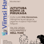 11:00 - 13:00Jututuba kohvi ja pirukaga Randvere päevakeskuses. Mängime lauamänge ja kuulame Erle Meresmaa muljeid Filipiinidelt