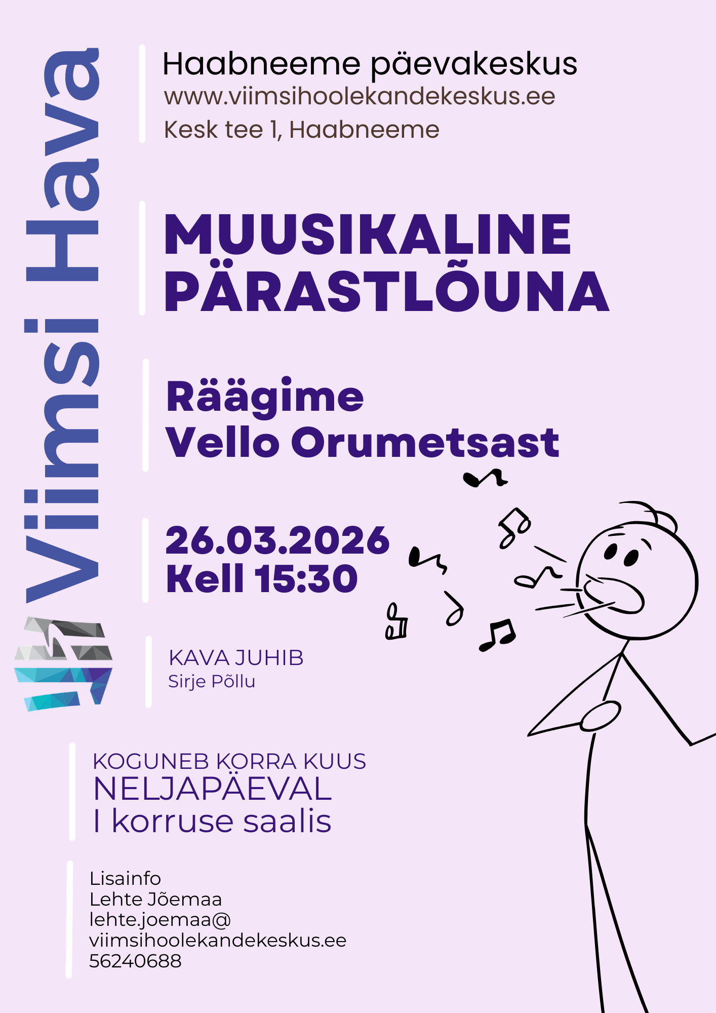 2026 veebruar ETKNRLP 2627282930311Events for jaanuar 26 13:00 - 14:00Jõusaali treening 16:00 - 18:00Viimsi Hoolekandekeskuse 5. aastapäev ja UUE NIME avalikustamine 17:30 - 19:00Rahatarkuse klubi. Asendustund 12.01 tunnileEvents for jaanuar 28 12:00 - 13:30Silmaringi Seltsing Haabneeme päevakeskuses 13:00 - 14:00Jõusaali treeningEvents for jaanuar 29 10:30 - 12:00Jututuba kohvi ja pirukaga Randvere päevakeskuses. Külas on raamatu Kohanemise meistriklass autor JÜRI LEHTMETSEvents for jaanuar 30 11:00 - 13:00Vaimse tervise hommik. Mälutreening ja robootika 13:00 - 14:00Jõusaali treeningEvents for veebruar 1Sündmused puuduvad2345678Events for veebruar 2 16:45 - 17:45Elujõu saalitreeningEvents for veebruar 3Sündmused puuduvadEvents for veebruar 4 11:00 - 13:00Jututuba kohvi ja pirukaga Randvere päevakeskuses. Mängime lauamänge ja kuulame Erle Meresmaa muljeid Filipiinidelt 14:00 - 16:00Haabneeme päevakeskuse rahvatantsurühm SiiraViira esineb Rannapere pansionaadi elanikeleEvents for veebruar 5 15:30 - 17:00Lauluklubi. Külaline: Anne VelliEvents for veebruar 6 11:00 - 13:00Haabneeme päevakeskuse kohvihommiku külaliseks on Erle Meresmaa. Mängime lauamänge ja kuulame Erle muljeid FilipiinideltEvents for veebruar 7Sündmused puuduvadEvents for veebruar 8 13:00 - 15:00Viimsi Suure Südame tegemine Lubja külaplatsil9101112131415Events for veebruar 9 16:45 - 17:45Elujõu saalitreeningEvents for veebruar 10 17:00 - 19:00Dementsusega isikute lähedaste tugirühmEvents for veebruar 11 12:00 - 13:30Arvutikursus IV Randvere päevakeskuses. Eelreg Aime Salmistu tel 56907520 12:00 - 14:00Silmaringi Seltsing. Jututuba uudishimulikele. Armastus on see… Vestlust veab Pille MölderEvents for veebruar 12Sündmused puuduvadEvents for veebruar 13 11:00 - 13:00Raamatuklubi. Kulle Raig. Vikerkaare värvid: Lennart Meri elu sõprade pilgu läbi 14:00 - 15:30Arvutikursus IV Randvere päevakeskuses. Eelreg Aime Salmistu tel 56907520Events for veebruar 14Sündmused puuduvadEvents for veebruar 15Sündmused puuduvad16171819202122Events for veebruar 16 16:45 - 17:45Elujõu saalitreening 17:30 - 19:00Rahatarkuse klubi. Tiiu Lumberg. Investeerimine ja AI (I): kuidas võiks kasutama hakata?Events for veebruar 17 12:00 - 14:00Vastlapäeva tähistamine Randvere päevakeskusesEvents for veebruar 18 12:00 - 13:30Arvutikursus IV Randvere päevakeskuses. Eelreg Aime Salmistu tel 56907520 17:00 - 19:00Meeleoluõhtu mälumängu ja muusikaga. Eve Niemi ja Andrus KalvetEvents for veebruar 19 14:00 - 16:00EV 108. aastapäev Randveres. Trio Naturale. Viimsi vald täna ja homme – Siiri Visnapuu, Viimsi vallavanemEvents for veebruar 20 14:00 - 15:30Arvutikursus IV Randvere päevakeskuses. Eelreg Aime Salmistu tel 56907520 14:00 - 16:00EV 108. aastapäev Haabneemes. Viimsi Kooli lastekoor, rahvatantsuansambel SiiraViira, Eesti Sõjamuuseumi teadur Ranno Sõnum – Eesti VabadussõdaEvents for veebruar 21Sündmused puuduvadEvents for veebruar 22Sündmused puuduvad2324252627281 Events for veebruar 23 16:45 - 17:45Elujõu saalitreeningEvents for veebruar 24Sündmused puuduvadEvents for veebruar 25Sündmused puuduvadEvents for veebruar 26 15:30 - 17:00Muusikaline pealelõuna. Teema: VELLO ORUMETS. Kava juhib Sirje PõlluEvents for veebruar 27 11:00 - 13:00Vaimse tervise hommik. Mälutreening ja robootika.Events for veebruar 28Sündmused puuduvad Kuupäev 26. veebruar 2026 Expired! Kellaaeg 15:30 - 17:00 Muusikaline pealelõuna. Teema: VELLO ORUMETS. Kava juhib Sirje Põllu Jaga üritust + Lisa Google kalendrisse + iCal / Outlook eksport